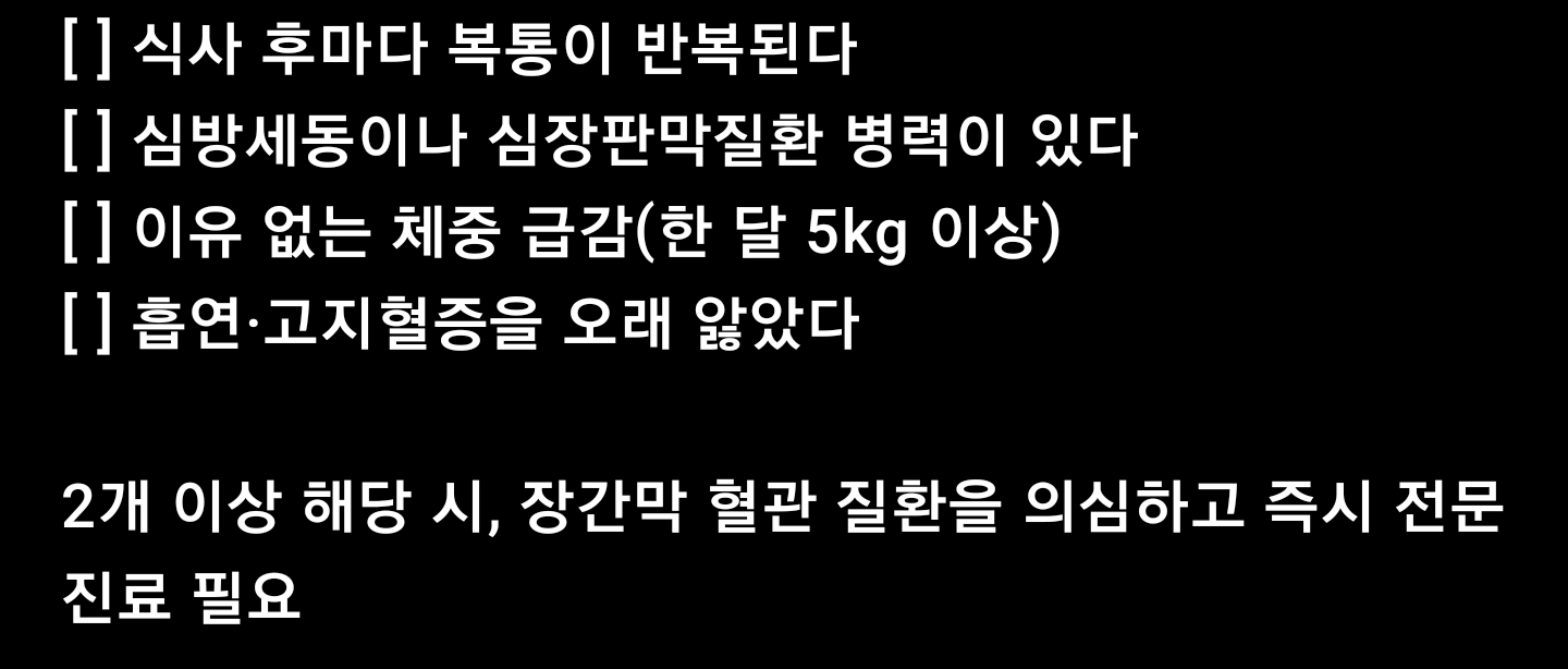 2개 이상 해당 시, 장간막 혈관 질환을 의심하고 즉시 전문 진료 필요