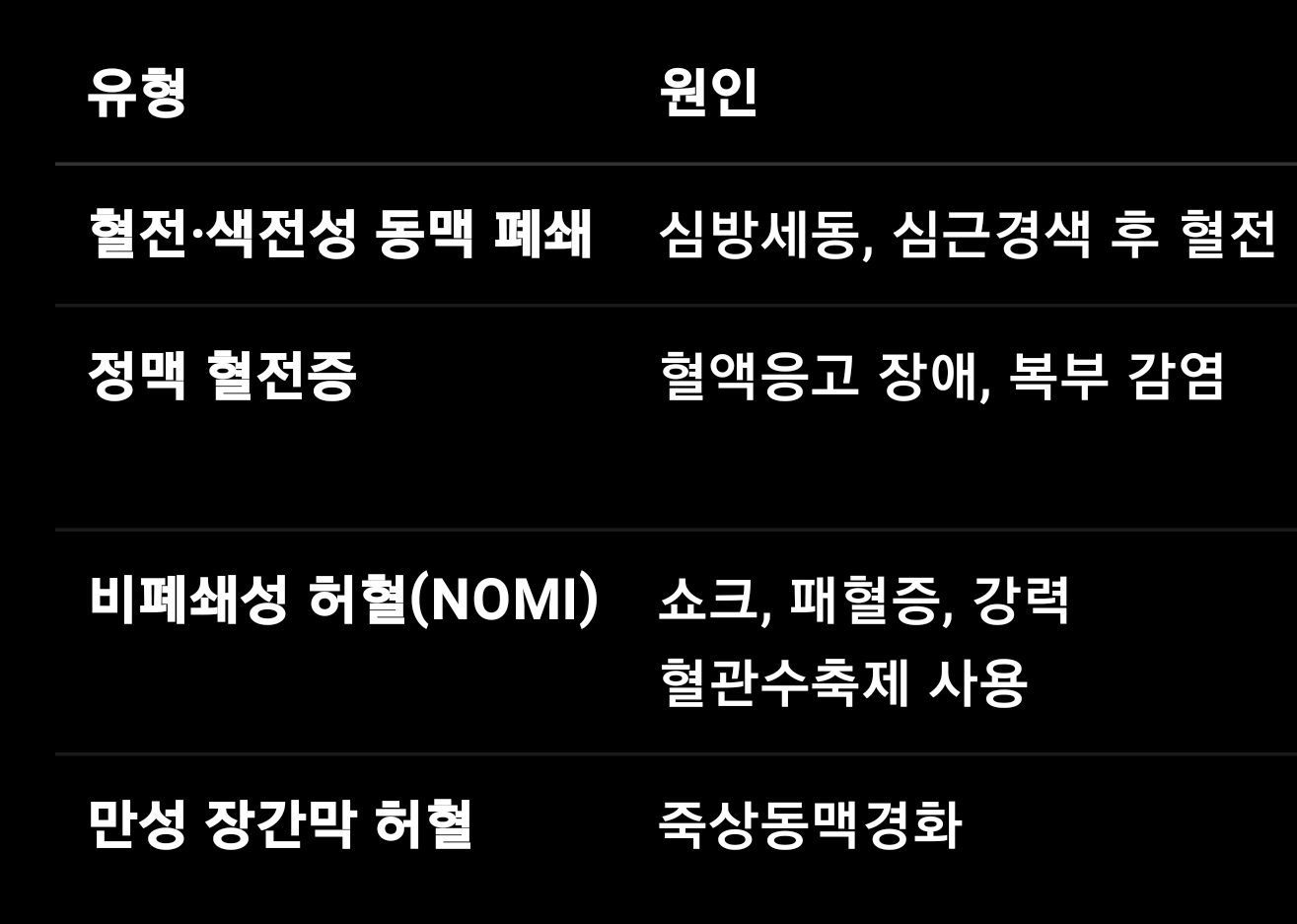 혈전·색전성 동맥 폐쇄 심방세동, 심근경색 후 혈전 급격한 발병, 극심한 복통